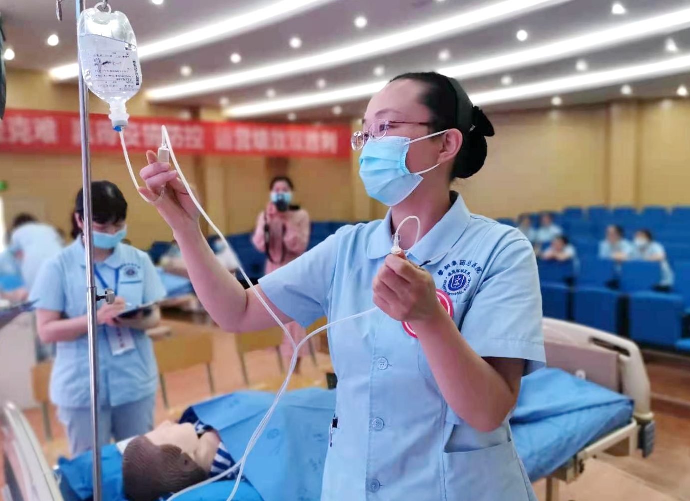 “需要我?guī)湍{(diào)整一個(gè)舒適的體位嗎?”、“小張,準(zhǔn)備搶救車、除顫儀,通知醫(yī)生搶救病人!”,“收到!”……比賽現(xiàn)場(chǎng)選手們沉著冷靜、動(dòng)作規(guī)范、言語溫和、思路清晰、配合默契,展示了優(yōu)秀的護(hù)理專業(yè)技能、應(yīng)變能力和人文素養(yǎng);評(píng)委們嚴(yán)肅認(rèn)真、公平公正。