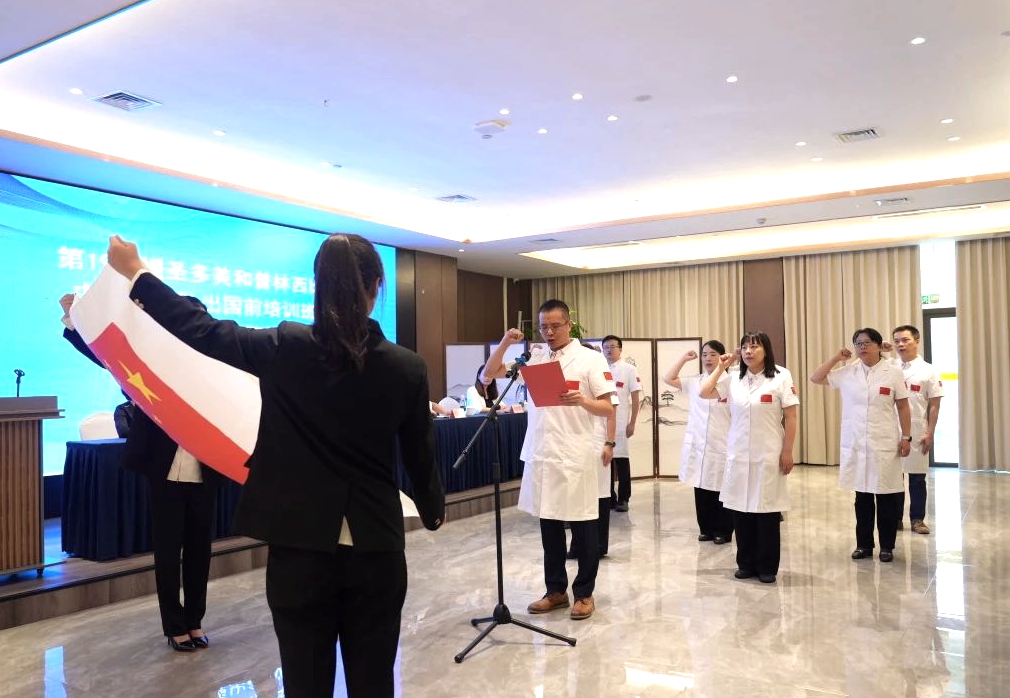 9月6日,四川省衛(wèi)生健康委員會在都江堰舉行了第19批援助圣多美和普林西比中國醫(yī)療隊(duì)出國前培訓(xùn)班結(jié)業(yè)典禮暨出征儀式。張順洪和其他8名隊(duì)員進(jìn)行了莊嚴(yán)宣誓。